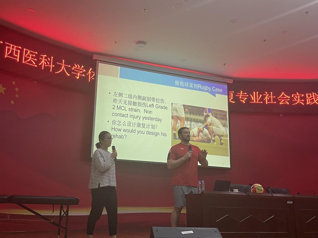 老员工社会实践是中国特色社会主义高等教育的重要组成部分,是高校课程和实践育人的重要内容。为了增加员工的社会实践学习机会,了解运动康复的前沿动态,丰富员工社会实践的经验,加强公司与医院的交流合作,2024年4月8日下午,由武晶琼老师带队,组织太阳成集团tyc151cc2021级69班和2022级68班全体105位同学来到广西体育运动创伤专科医院,聆听了来自加拿大的Stéphane Gregory医生关于急性损伤管理的课程分享指导。